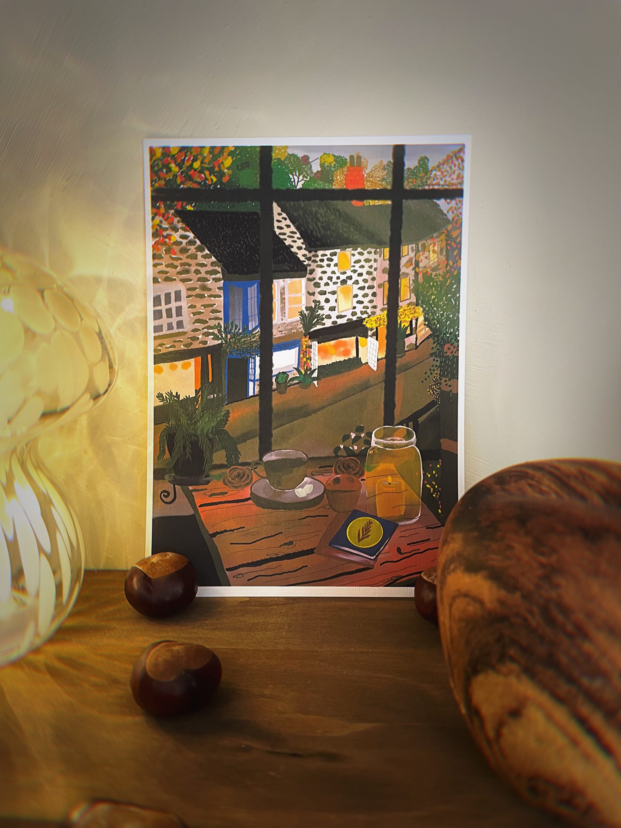 J’ai créé cette illustration Ă  partir d’une photo, en y ajoutant ma touche personnelle ! Elle est imprimĂ©e par mes soins sur une feuille A5 de 250 g texturĂ©e.